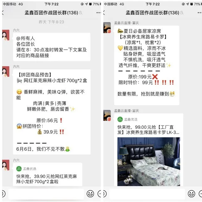 爆品推荐、直播推送、早晚安问候语、下单引导......孟鑫百团同步开启拼团社群营销活动,顾客与导购之间的交流仅靠手机就能完成,开团首日火爆非凡,社群内活跃异常,近百名团长(导购)同场竞赛、热情高涨,一些团长甚至开启了电话营销,销售数据伴随着大家的欢呼节节高升!