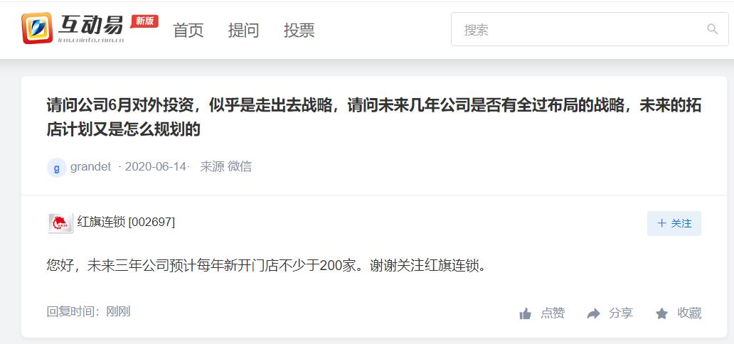 红旗连锁在互动平台表示,未来三年公司预计每年新开门店不少于200家。