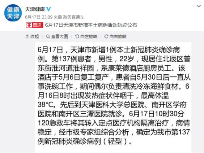 这个情况,最新一起事件,就是6月17日天津一个餐厅的洗碗工的一起确诊案例。天津市卫健委的官博在公布这起病例时,竟然会强调一句:该患者偶尔负责清洗冷冻海鲜食材。