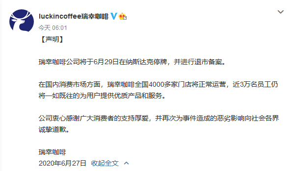 6月28日,瑞幸咖啡今日发布声明称,瑞幸咖啡公司将于6月29日在纳斯达克停牌,并进行退市备案。声明表示,在国内消费市场方面,瑞幸咖啡全国4000多家门店将正常运营,近3万名员工仍将一如既往的为用户提供优质产品和服务。公司衷心感谢广大消费者的支持厚爱,并再次为事件造成的恶劣影响向社会各界诚挚道歉。