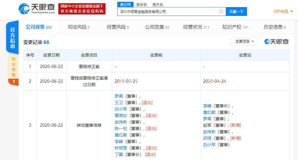 天眼查数据显示,近日,深圳中顺易金融服务有限公司发生工商变更,王卫卸任董事,丁磊卸任董事长。据中顺易官网介绍,其由中信信托、顺丰、网易联合发起,于2015年5月在深圳前海自由贸易区成立,为金融科技公司。天眼查股东信息显示,该公司工商披露的股东中...