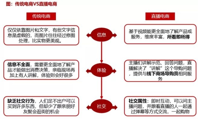 传统电商的痛点是选择太多、商品信息又不全面,缺少线下购物的社交属性。因为在商品信息展示方面,视频比图文更丰富,主播能够扮演线下导购角色、跟观众实时互动,再加上网红、明星的参与,直播购物又有了更多的娱乐属性,因此,直播电商解决了传统电商上述痛点中的部分问题。