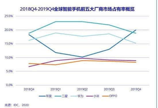 根据IDC公布的2020年第一季度全球手机出货量,全球排名前五的分别是三星、华为、苹果、小米和VIVO,而曾经的第五OPPO已沦为“其它”之列。