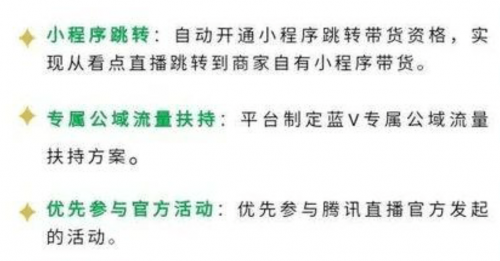 腾讯直播表示,在2020年7月20日0点前缴纳599元/半年技术服务费的商家和内容主们,将自动升级为腾讯直播蓝V用户,以上为部分蓝V特权。