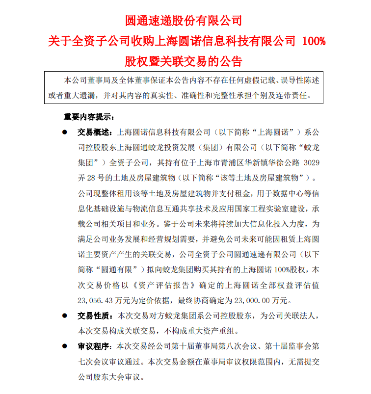 圆通速递公告,公司全资子公司圆通有限拟向控股股东蛟龙集团购买其持有的上海圆诺100%股权,其持有位于上海市青浦区华新镇华徐公路3029弄28号的土地及房屋建筑物。公司现整体租用该等土地及房屋建筑物并支付租金,用于数据中心等信息化基础设施与物流信息互通共享技术及应用国家工程实验室建设,承载公司相关项目和业务。标的协商价格为2.3亿元。