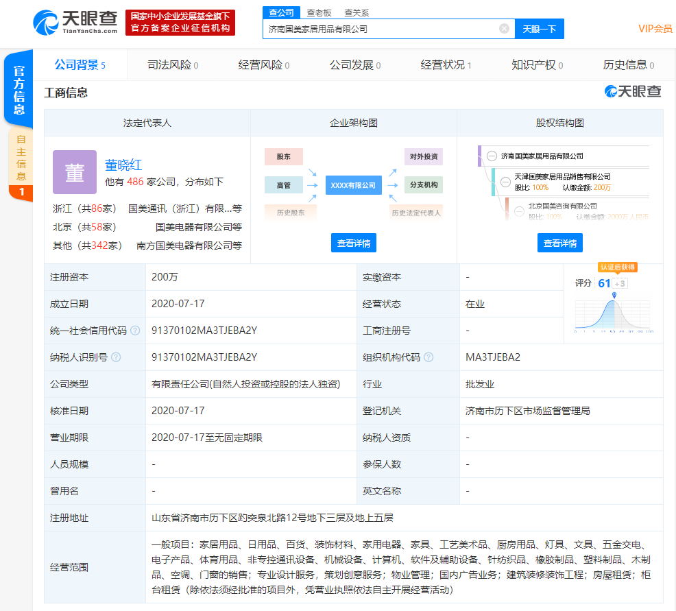 天眼查数据显示,7月17日,济南国美家居用品有限公司成立,注册资本200万人民币,经营范围包括家居用品、日用品、百货、装饰材料、家用电器、家具、工艺美术品、厨房用品、灯具、文具、五金交电、电子产品等。该公司是国美电器有限公司全资持股的子公司。