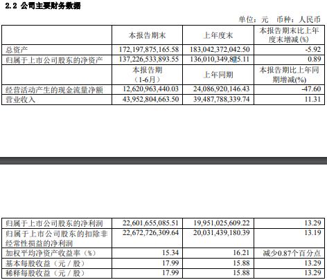 贵州茅台发布2020年半年度报告。公司今年上半年营收439.53亿元,同比增长11.31%;净利润226.02亿元,同比增长13.29%。当日贵州茅台股价上涨2.92%,收于每股1670元。其第一季度报告显示,公司今年一季度营收244.05亿元,同比增长12.76%;净利润130.93亿元,同...