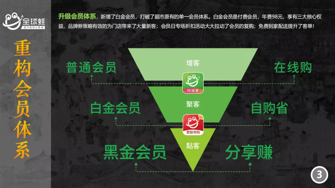 首先,我们打造了三大会员体系,普通会员在线购、白金会员自购省、黑金会员分享赚,用新会员体系,拉来新客,稳固老客。