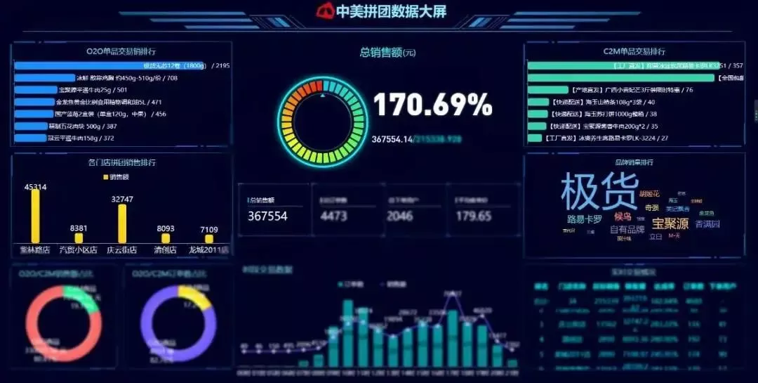 我们同时还提供数智报表APP,通过对商品、销售、导购、订单、会员、营销、专题等多个维度数据的统计分析,将目标数据通过报表、数据大屏实现可视化。我们赋能的很多超市在拼团中都使用了我们提供的数据大屏,所有的销售数据、导购排名实时在线更新,让门店、导购都能赛起来,驱动目标高效达成。