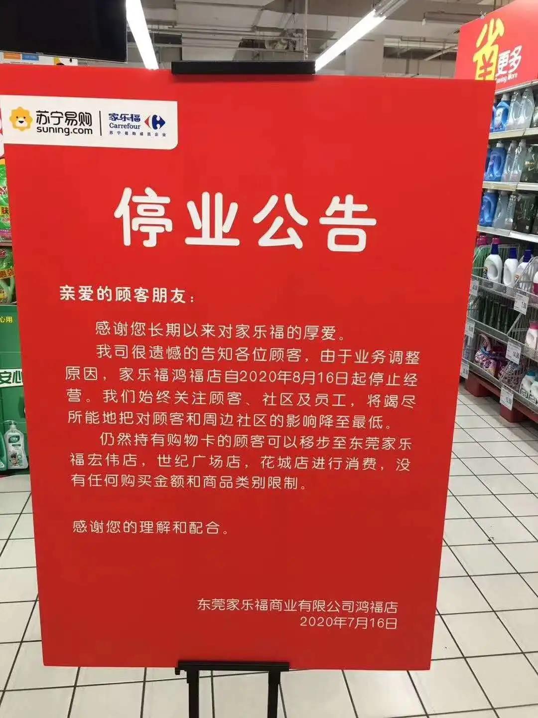 家乐福东莞鸿福店将于8月16日起停止经营,闭店原因是“业务调整”。据停业公告显示,鸿福店关闭后,家乐福在东莞还有3家门店,分别是是宏伟店、世纪店和花城店。