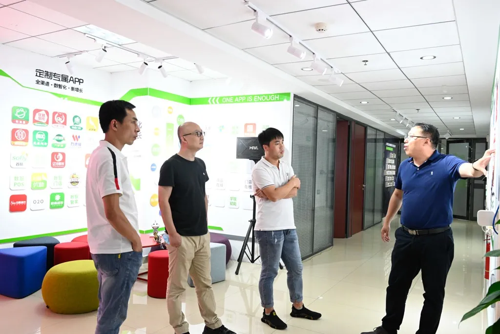 8月14日上午,河北诚信商厦百货集团总经理李世越、河北诚信商厦超市事业部总经理郭维亮、河北诚信商厦超市事业部总经理吴琦在全球蛙总裁钟道锋的陪同下参观了全球蛙总部。