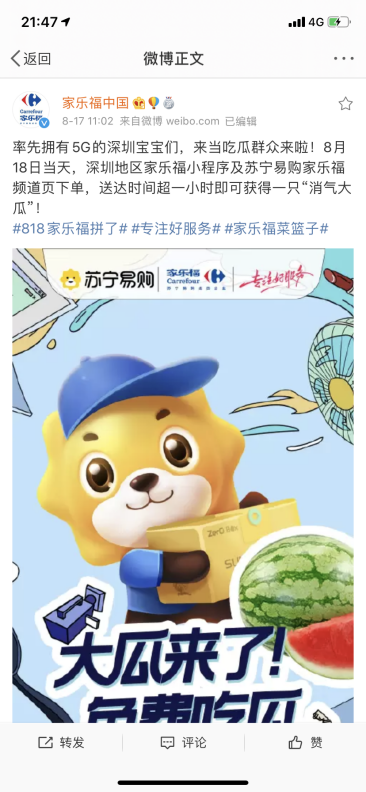 818购物狂欢节作为苏宁一年一度的重磅大促,家乐福配送到家服务开足马力!为防止由于订单暴涨给顾客造成延时配送的不愉快体验,苏宁家乐福特别推出了消气大瓜的延时福利,免费送瓜上门! 8月18日当天,深圳地区消费者在家乐福小程序及苏宁易购家乐福频道页下...