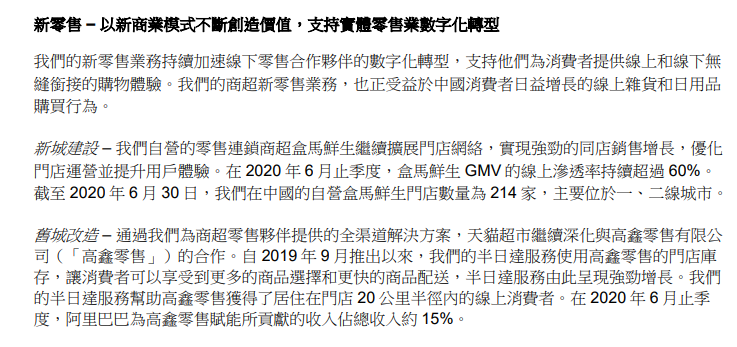 阿里巴巴发布2021财年第一财季财报。财报显示,第一财季,盒马鲜生GMV的线上渗透率持续超过60%。截至2020年6月30日,其在中国的自营盒马鲜生门店数量为214家,主要位于一、二线城市。