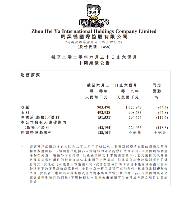 周黑鸭公布2020年上半年财报,周黑鸭上半年营收9.03亿元,同比减少44.4%;毛利4.93亿元,同比减少45.8%;公司拥有人应占亏损4219.4万元,同比下降118.8%;期间经调整亏损2810.1万元,每股亏损0.02元。