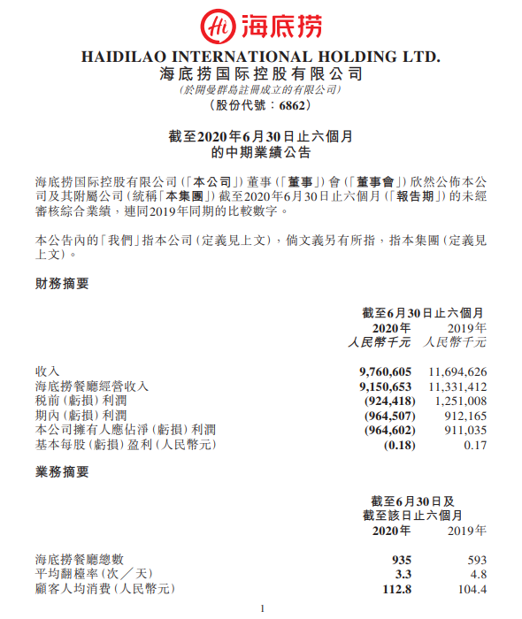 8月25日晚间,海底捞公布了2020年中期业绩报告。财报显示,2020年上半年,海底捞实现收入97.6亿元。今年上半年,海底捞外送业务收入超4亿元,占总收入的比重由去年同期的1.6%增至4.2%。此外,海底捞积极推动门店拓展,新开173家餐厅,截至2020年6月30日,海底捞全球门店数量达到935家,翻台率则恢复至3.3次/天。
