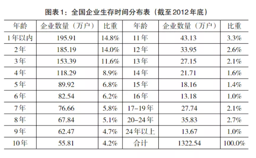 截至2012年底,全国1322.54万户内资企业中,生存时间五年以下的占企业总量的接近一半(49.4%);企业五年累计消亡三成以上;近五年退出市场的企业平均寿命为6.09年,寿命在五年以内的接近六成。
