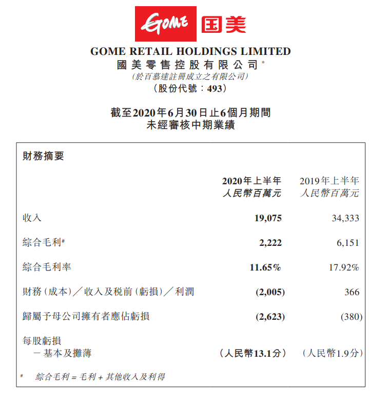国美零售预期中期亏损25-30亿元 料GMV同比增长超70%