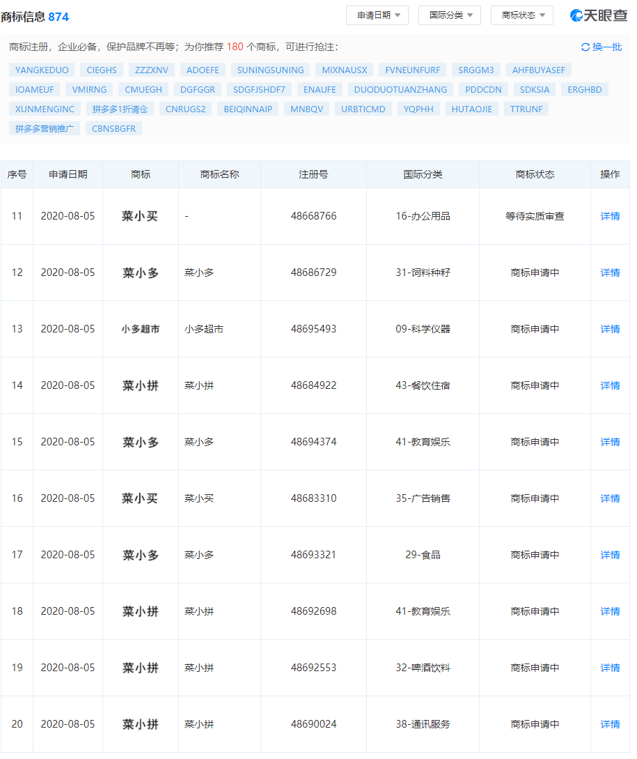 天眼查App显示,近日拼多多关联公司上海寻梦信息技术有限公司新增多条商标信息,其中包括多多超市菜小买菜小多小多超市等,商标状态为:商标申请中。申请日期均为2020年8月5日,涉及国际分类包括:餐饮住宿、广告销售、运输贮藏、方便食品、啤酒饮料、网站服...