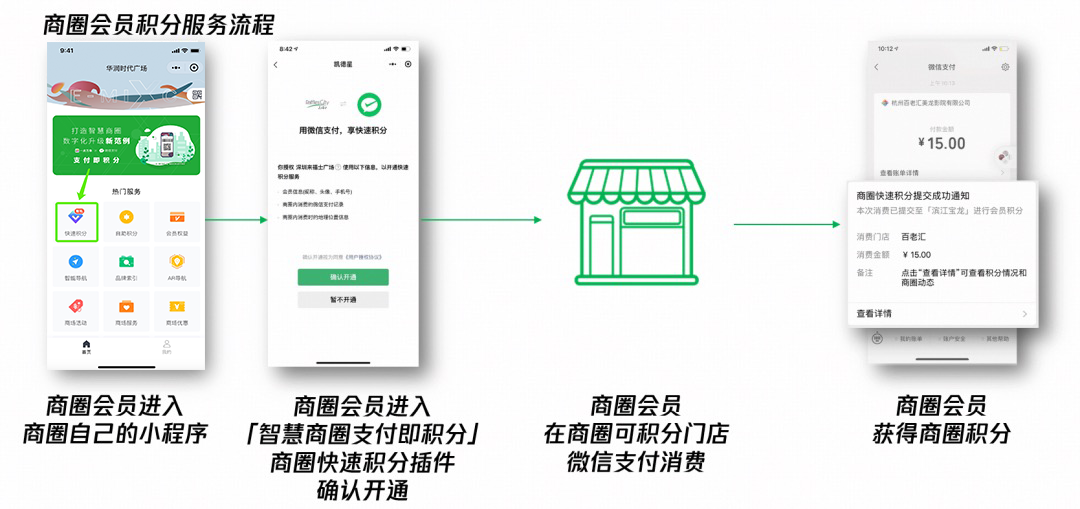 上线“微信支付快速积分”后,“万象会”会员能通过微信支付自动积分,还可以用积分抵用停车费;商圈经营者也能通过会员支付、积分情况了解到真实的经营情况。