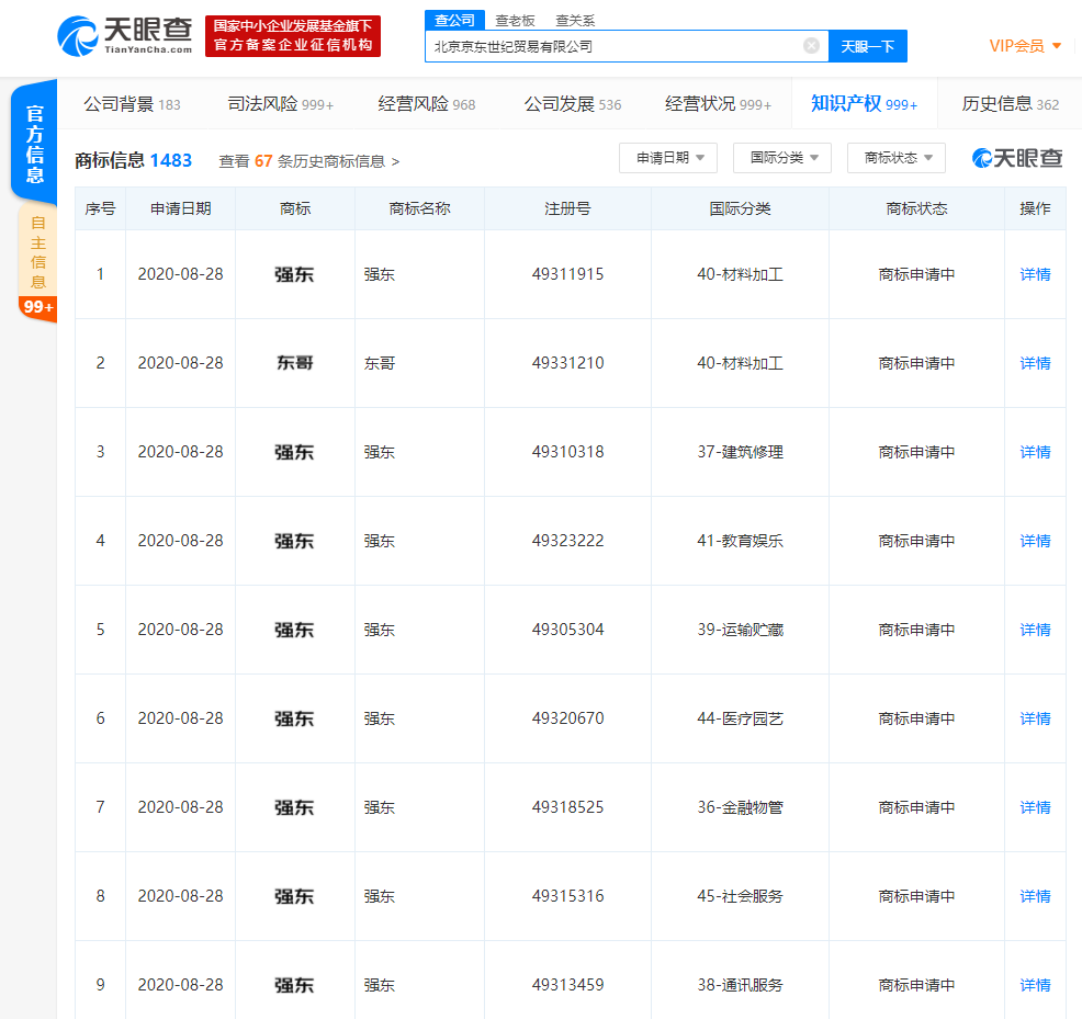 天眼查App显示,近日,北京京东世纪贸易有限公司新增多条商标信息,其中包括多条“东哥”“强东”的商标,申请日期在2020年8月28日,商标状态均显示为“商标申请中”。北京京东世纪贸易有限公司由京东香港国际有限公司全资持股。