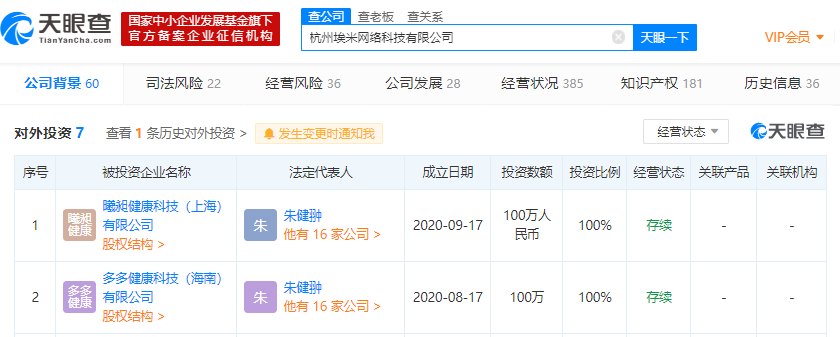 天眼查App显示,2020年9月17日,曦昶健康科技(上海)有限公司成立。该公司注册资本为100万元人民币,法定代表人为拼多多高级副总裁朱健翀,公司经营范围包括食品经营;第三类医疗器械经营等,由拼多多关联公司杭州埃米网络科技有限公司全资持股。此外,杭州埃米网络科技有限公司于8月在海南全资成立一家健康科技公司,经营范围包含第三类医疗器械经营等,法定代表人同为朱健翀。
