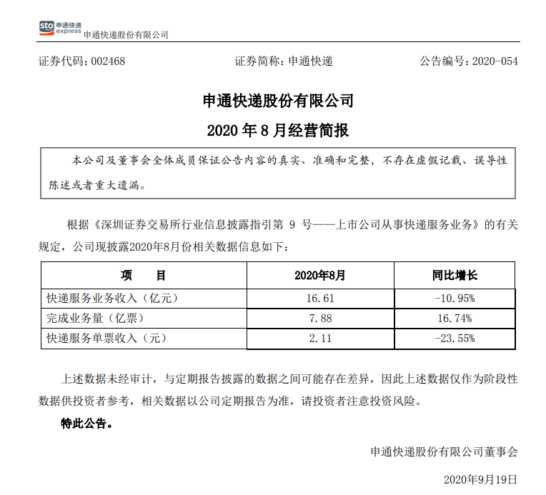 申通快递发布《2020 年8月经营简报》,该简报显示,8月,公司实现快递服务业务收入16.61亿元,同比减少10.95%;完成业务量7.88亿票,同比增长16.74%;快递服务单票收入2.11元,同比减少23.55%。