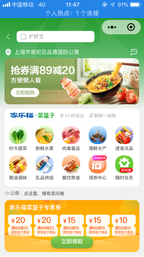 为响应国家菜篮子工程号召,全力保障消费者生鲜消费需求,为百姓“菜篮子”减负,家乐福开启“菜篮子”活动,消费者可以通过苏宁易购APP、家乐福微信小程序等平台,从“菜篮子”频道购买米面粮油、乳品烘焙、水产肉类、蔬菜水果等食物。比如,家乐福在线上线下推出猪肉“省心价”活动,将预备约800吨安全、新鲜的优质鲜猪肉,以低于其他生鲜电商平台的价格回馈消费者,助力普通百姓实现“猪肉自由”。所有线上下单的用户,只要是家乐福门店三公里范围内的订单,最快25分钟便可送到家。