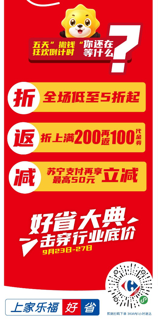 据悉,家乐福百亿补贴好省大典狂欢倒计时,百万好物击穿底价,折返减福利多多。即日起至9月27日,全场低至5折起、折上再满200元返100元、指定支付方式最高再减50元。临近双节,家乐福将以好省价、好货配好券等实力优惠,给千家万户的这场中秋团圆宴添一分热闹和暖心!(产品促销机制或有不同,详情请洽各门店工作人员或参考店内海报)
