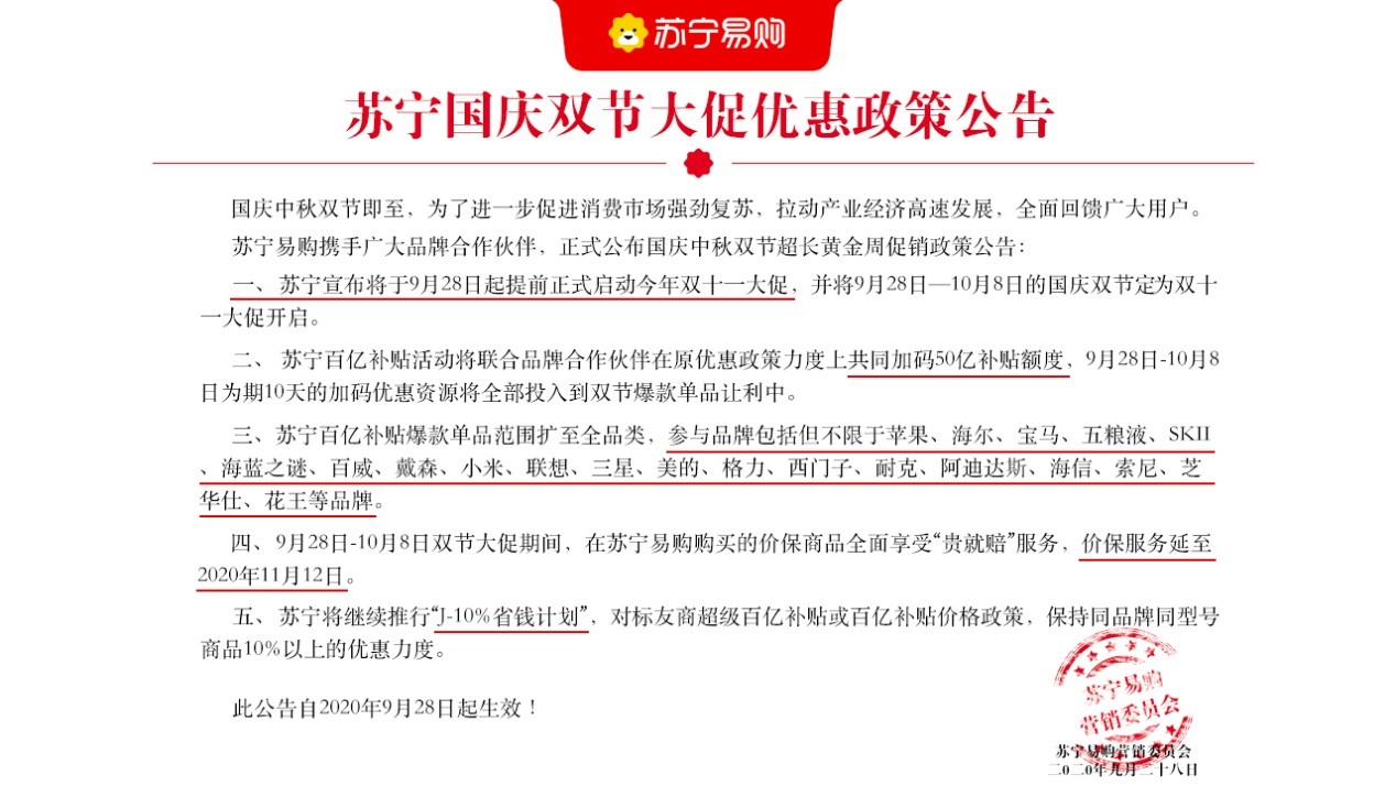 公告称,2020年9月28日-10月8日期间,在原有百亿补贴基础上,苏宁易购联合各大品牌合作伙伴,追加50亿双节补贴,热销商品最低可至5折。