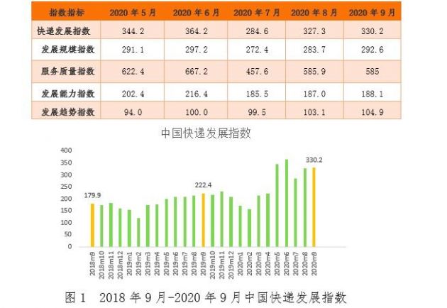 10月10日消息,据国家邮政局发布的数据显示,经测算,2020年9月中国快递发展指数为330.2,同比增长48.5%。其中,发展规模指数、服务质量指数和发展趋势指数分别为292.6、585和104.9,比上年同期分别提高26.8%、87.5%和41.8%,均保持高速增长态势。发展能力指...