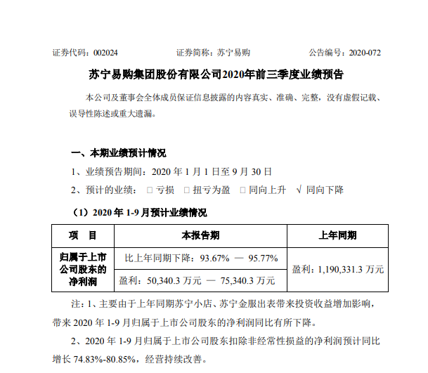 苏宁易购公告,预计前三季度净利润为5.03亿元-7.53亿元。主要由于上年同期苏宁小店、苏宁金服出表带来投资收益增加影响。2020年7-9月归属于上市公司股东扣除非经常性损益的净利润预计同比增长68.82%-94.80%,经营持续改善。