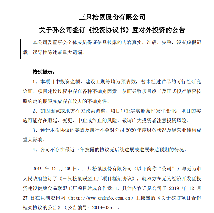 三只松鼠发布公告称,全资孙公司华东供应链与安徽无为经济开区管委会签订了《投资协议书》,就华东供应链和多家供应商企业在无为市设立多家企业共同在拟建设的三只松鼠联盟工厂依法经营事宜达成合作意向。项目投资总额为20.6亿元,分两期进行,一期总投资约1...