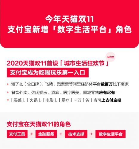 蚂蚁集团CEO胡晓明表示,“双11是全年最重要的消费节日,支付宝推出城市生活主会场,就是希望将双11的线上消费力反哺到线下,让线下服务业商家也能抓住这波增长机遇。”