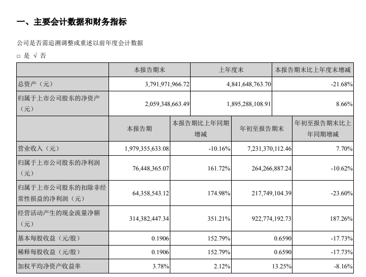 三只松鼠发布2020年第三季度财报,第三季度营收19.79亿元,同比下降10.16%;归属于上市公司股东的净利润为0.76亿元,同比增长161.72%。