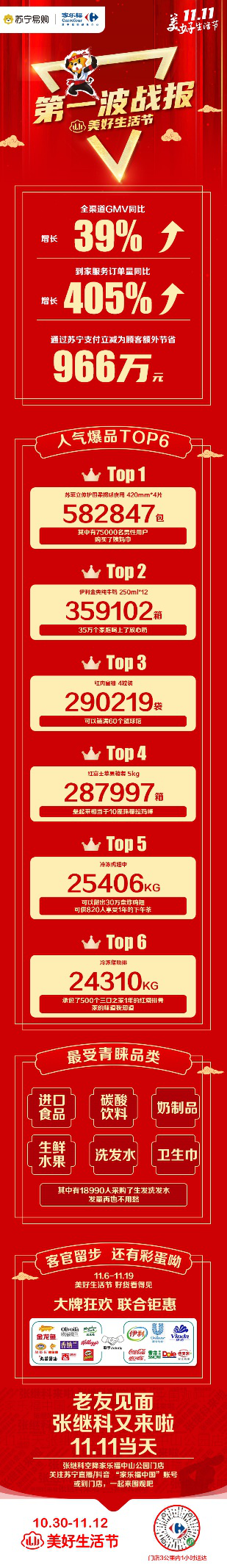 截至到11月3日20:00,苏宁家乐福数据显示:全渠道销售额同比增长 39%,到家业务订单量同比增长 405%,到店客流量相比日常周末增加明显,11月1日当天有超过120万人在逛家乐福门店、130万人在手机逛家乐福。据家乐福中国COO张其喆介绍,今年双十一家乐福通过融入苏宁全场景、全渠道、全产业体系,在场景拓展、供应链融合、数字化赋能、会员打通、O2O运营等方面全面整合,在用户端通过折扣、爆款、支付立减等方式补贴用户,实现流量的高效转化。