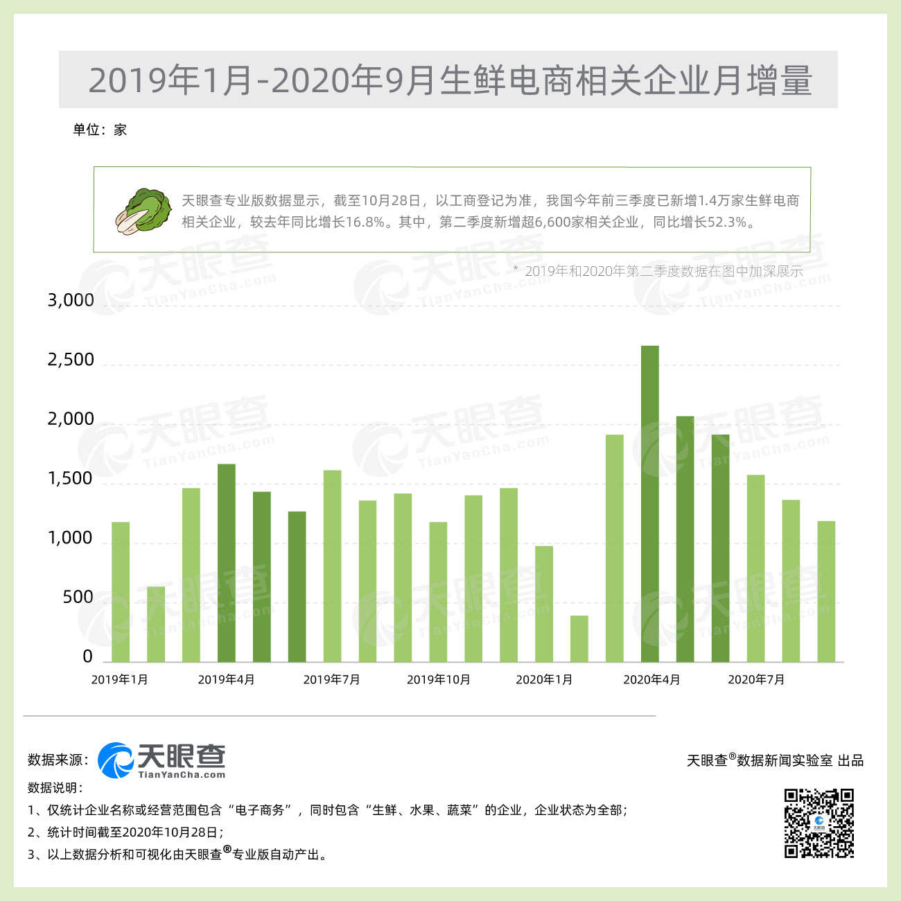 天眼查专业版数据显示,中国近87%的生鲜电商相关企业(全部企业状态)注册成立于5年以内。截至10月28日,以工商登记为准,中国今年前三季度已新增超1.4万家生鲜电商相关企业,较去年同比增长16.8%。其中,二季度新增超过6600家相关企业,同比增长52.3%。...