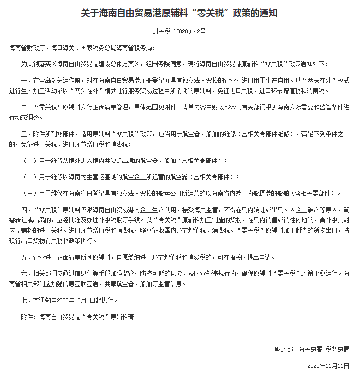 财政部、海关总署、税务总局发布关于海南自由贸易港原辅料“零关税”政策的通知。通知指出,在全岛封关运作前,对在海南自由贸易港注册登记并具有独立法人资格的企业,进口用于生产自用、以“两头在外”模式进行生产加工活动或以“两头在外”模式进行服务贸易过程中所消耗的原辅料,免征进口关税、进口环节增值税和消费税。