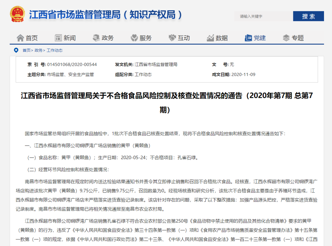 龙商网消息:日前,江西省市场监督管理局发布了《江西省市场监督管理局关于不合格食品风险控制及核查处置情况的通告(2020年第7期 总第7期)》。通告显示,江西永辉超市有限公司铜锣湾广场店因在黄甲中检测出孔雀石绿被罚12.5万元。 以下为通告原文: 江西省...