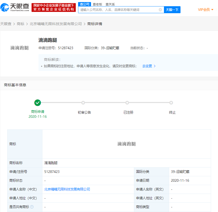 天眼查App显示,近日,北京嘀嘀无限科技发展有限公司新增滴滴跑腿商标申请,国际分类为运输贮藏,商标状态为商标申请中。据报道,滴滴跑腿业务由原来的代驾团队负责,于今年3月10日宣布上线,目前在上海、广州、深圳、重庆等19个城市上线运营。...