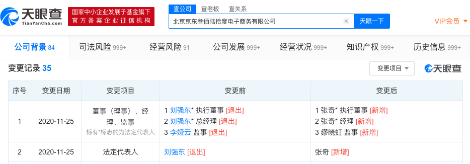 36氪获悉,天眼查App显示,近日,北京京东叁佰陆拾度电子商务有限公司发生工商变更,刘强东退出法定代表人、总经理、执行董事,由张奇接任法定代表人、执行董事、经理。同时,李娅云退出监事,由缪晓虹接任。北京京东叁佰陆拾度电子商务有限公司成立于2007年4月,注册资本为9.2亿,经营范围包含批发、零售机械设备、五金交电、建筑材料、电子产品等。