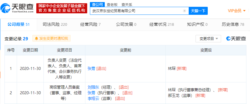 天眼查App显示,近日,武汉京东世纪贸易有限公司发生工商变更,刘强东退出经理,张雱退出董事,李娅云退出监事,同时新增林琛任职执行董事兼总经理,以及郝玉龙任职监事。武汉京东世纪贸易有限公司成立于2011年2月,注册资本为1亿人民币,经营范围包含货物或技术进出口;软件的研发及设计;仓储服务(不含危险品)等,由北京京东世纪贸易有限公司全资控股。