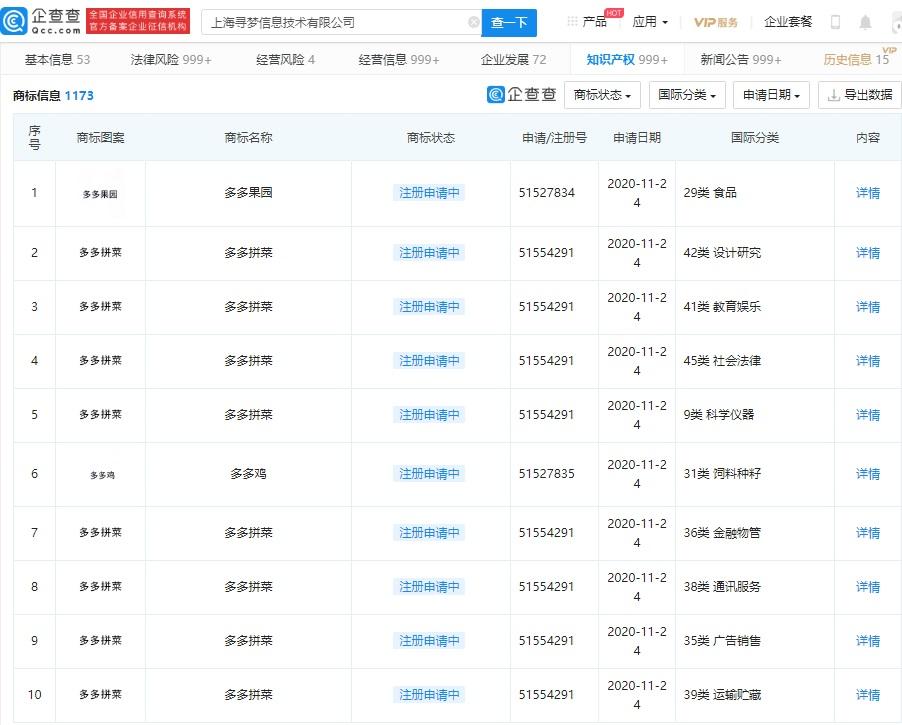 据天眼查,上海寻梦信息技术有限公司新增“多多拼菜”“多多鸡”“多多果园”等商标信息。商标涉及的国际分类包含社会服务、办公用品、运输贮藏、教育娱乐等,目前商标状态为“商标申请中”。