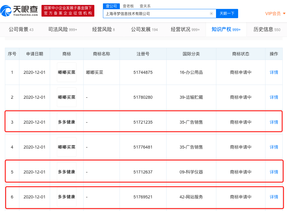 天眼查App显示,近日,拼多多关联公司上海寻梦信息技术有限公司申请注册“多多健康”商标,申请日期均在2020年12月1日,国际分类涉及科学仪器、广告销售、网站服务,商标状态显示为“商标申请中”。