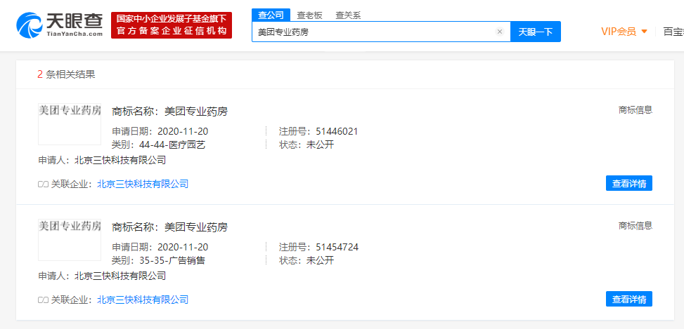 天眼查App显示,近日,美团的关联公司北京三快科技有限公司新增美团专业药房商标,国际分类为医疗园艺、广告销售。