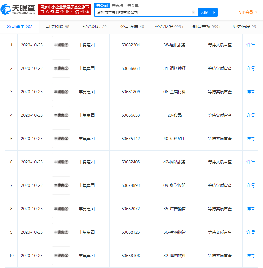 天眼查App显示,近日,深圳市丰巢科技有限公司申请注册多个丰巢惠团商标,申请日期为10月23日,国际分类涉及方便食品、材料加工、教育娱乐等,商标状态均为等待实质审查。...