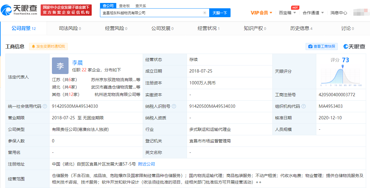 宜昌旭东科越物流有限公司成立于2018年7月,注册资本1000万人民币,由JD Bright Development XI (HK) Limited 100%持股。