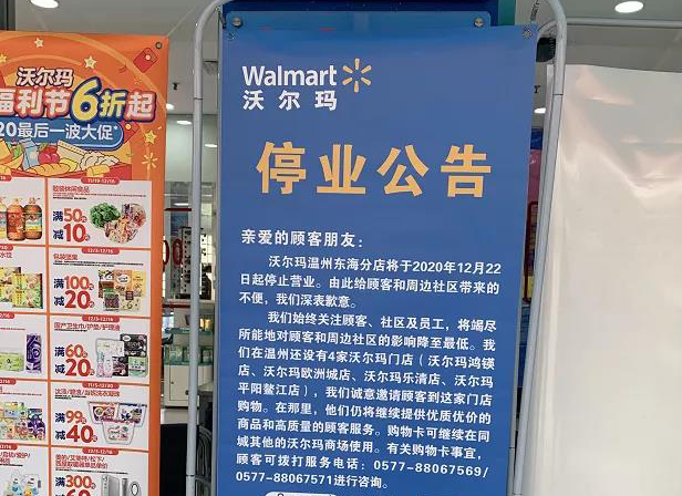 12月16日,沃尔玛温州东海分店贴出停业公告,门店将于2020年12月22日起停止营业。该店关闭后,沃尔玛在温州还有4家门店,分别是欧洲城店、鸿锳店、乐清店、平阳鳌江店,消费者的购物卡可以继续在同城其他的沃尔玛门店使用。