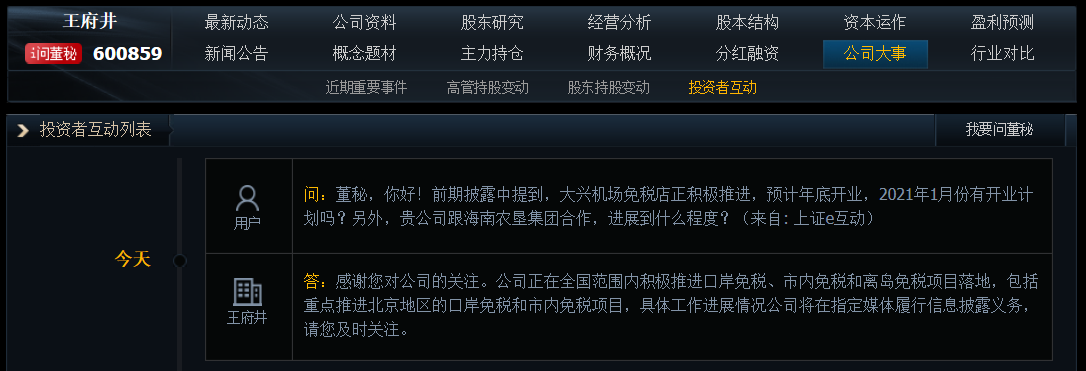 今日,王府井在互动平台表示,公司正在全国范围内积极推进口岸免税、市内免税和离岛免税项目落地,包括重点推进北京地区的口岸免税和市内免税项目。