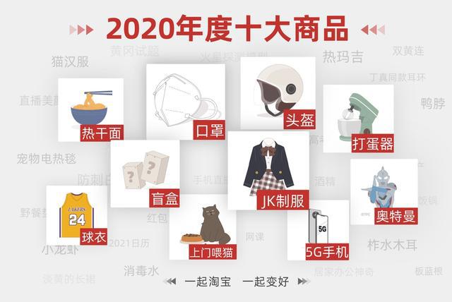 12月21日,淘宝发布“2020年度十大商品”,分别为口罩、打蛋器、上门喂猫、热干面见证疫情特殊时期的商品;也有与社会热点紧密结合的头盔、球衣、5G手机和JK制服、奥特曼、盲盒年轻人的新兴喜好产品。