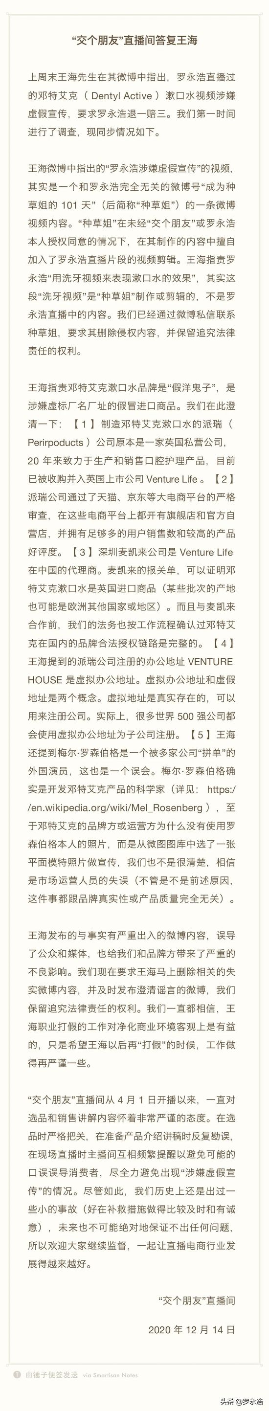 针对12月13日,职业打假人王海在微博喊话罗永浩,称直播售卖的某品牌漱口水用洗牙视频来表现漱口水的效果涉嫌虚假宣传一事,交个朋友官方微博回复王海,“罗永浩涉嫌虚假宣传视频”是其他博主二次剪辑拼凑,并未经过“交个朋友”或“罗永浩”本人授权同意。